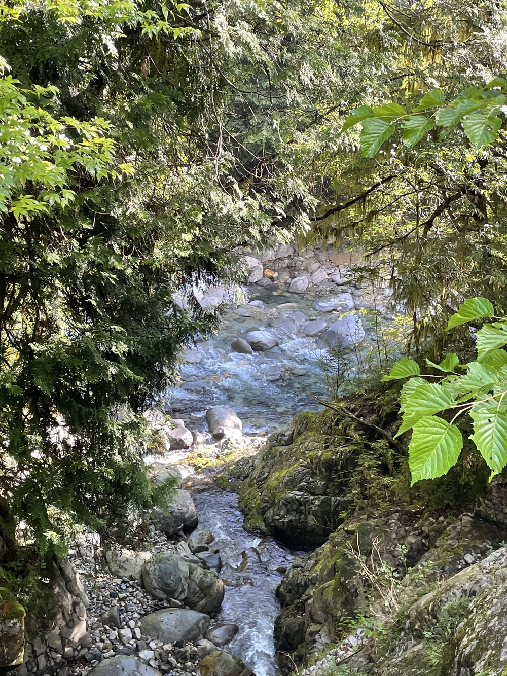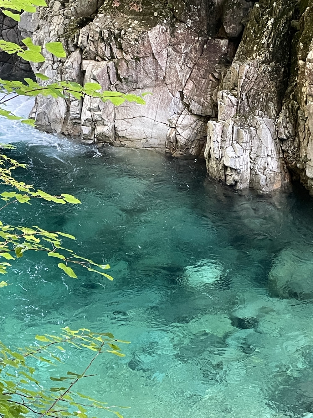 阿寺渓谷は木曽川の支流阿寺川が流れる約15kmの渓谷。人の手がほとんど入らない国有林を抜けて流れる川は、透明度が高く、美しい清流を作りだしています。水深によりエメラルドグリーンに見え、「阿寺ブルー🫐」と称されているそうです。