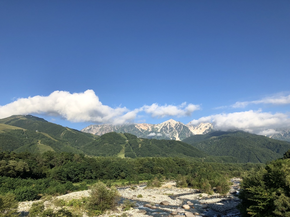 白馬大橋から美しい山々が見られたあなたはラッキー!そこから松川に降りて、夏は天然のアイシングをお楽しみください。