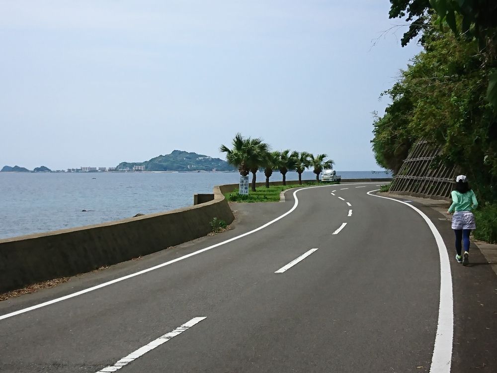 島の半分を周回するコース。眺めの良い海の横を走る所は歩道は無いが、車は少なく、快適に走れる。島へは橋がかかり、車でアクセス可。日帰り温泉の駐車場を起点にし、ラン後は温泉。レストランも美味しい❗