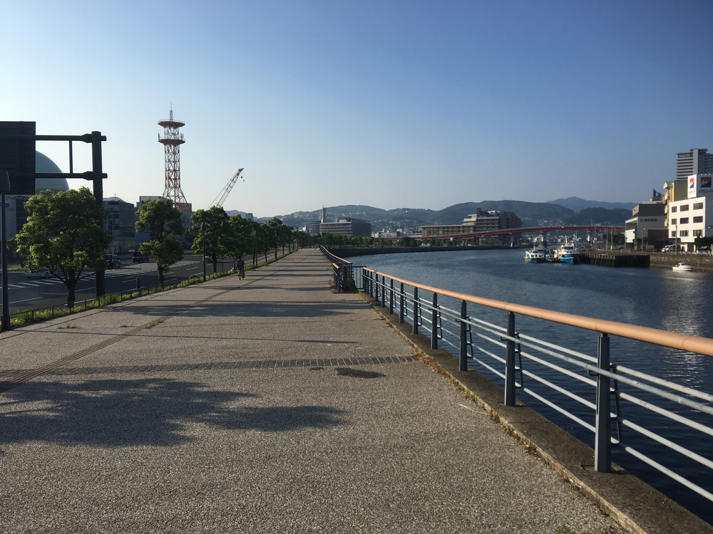 城山台からスタートすると途中から下りになりますが、それから長崎港までは平坦の道になります。梁川橋からはランニングコースがあり、多くのランナーに親しまれています。