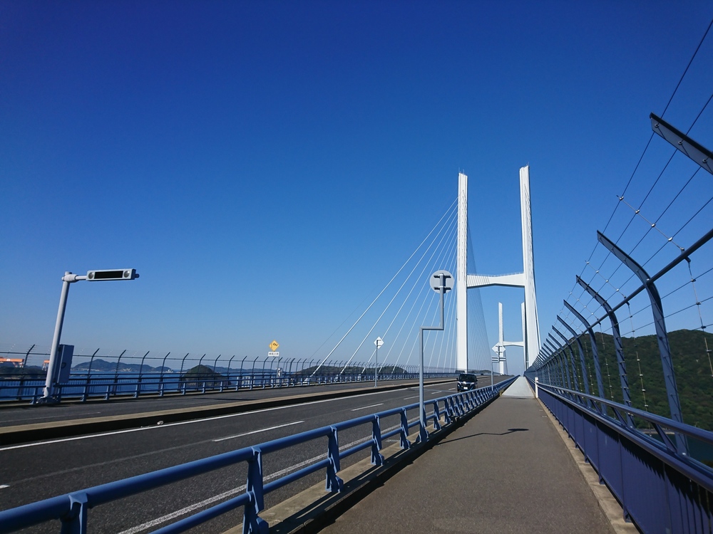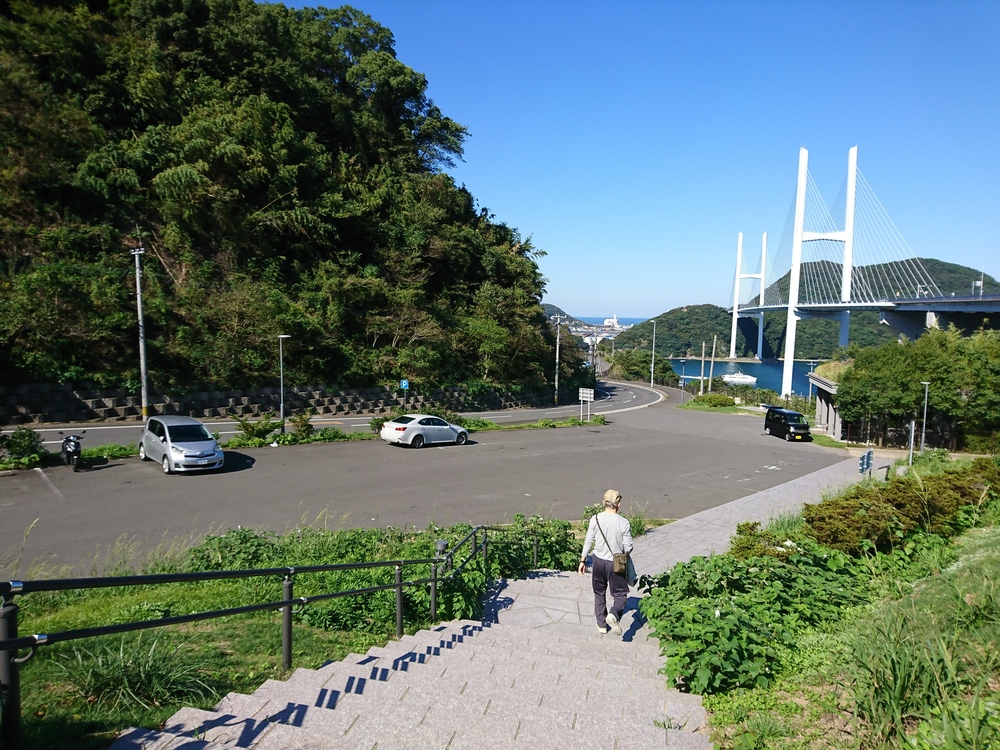 長さ1,289m、高さ170m(主塔)の斜張橋、その雄大な姿を見ながら周回する。道路は海抜60m、豪華客船など停泊する湾を眺めながら、外海には伊王島、高島を望む。晴れた日は遠く五島まで見える。正面には八郎岳、とにかく気分がすっきりするコース。スタート地点に駐車場とトイレがある。