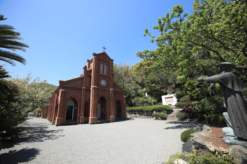 厳しい上りが待ち構えているが、その先の高台からの景色は素晴らしい。宮原展望台から次は福江島の観光名所の1つである「カトリック堂崎天主堂」へ向かう。ここの手前もまた水辺が美しく、りんご石など奇形の岩がある。