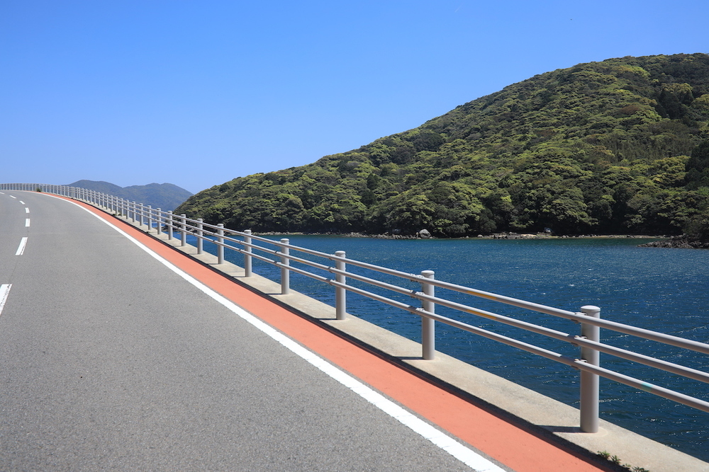 長崎県五島市福江島には素晴らしい自然とカトリック教会が有名な島であるが、そのどちらもを楽しめるのがこのコース。序盤は右手に奥浦湾の美しい海を見ながら走ることができ、赤い鉄橋を過ぎてしばらく進んだ先を右折したらそこは宮原展望所への道。