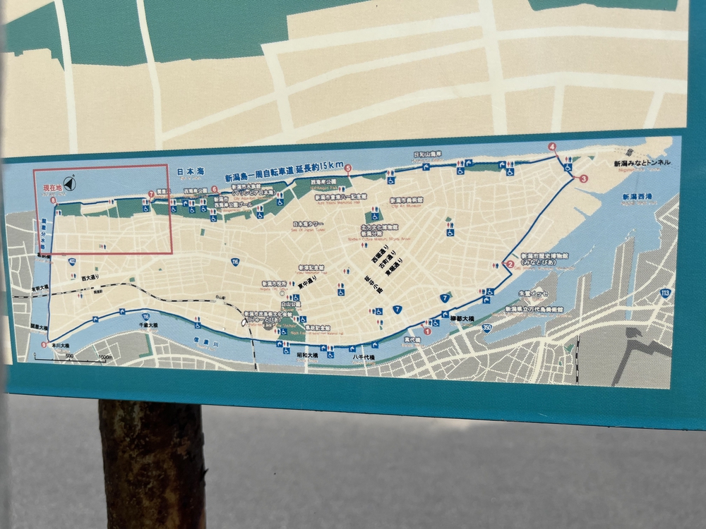 万代橋を起点に信濃川、関屋分水、日本海に囲まれた通称「新潟島」を海と川沿いの走りやすいフラットな道で1周約15㎞のコース。