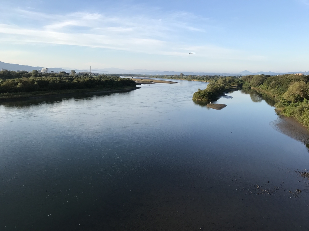 信濃川の河川敷コース。朝ジョグしていると東山から朝陽が眩しく爽やか