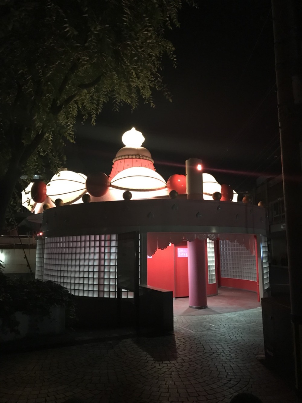 スタートとゴールは、こちらも夜のライトアップが綺麗な「ケーキトイレ」。