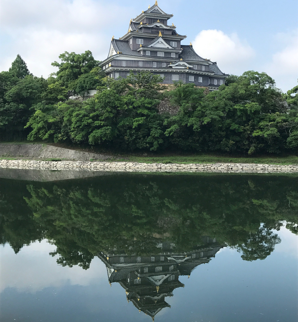 岡山駅東口よりメインストリートを東に進み旭川を渡ると日本三大庭園の1つ後楽園に辿り着く.木漏れ日の下を走りながら対岸に烏城(黒いからこう呼ばれる)を観ることができる.凪の日は川面に映る城が見事!