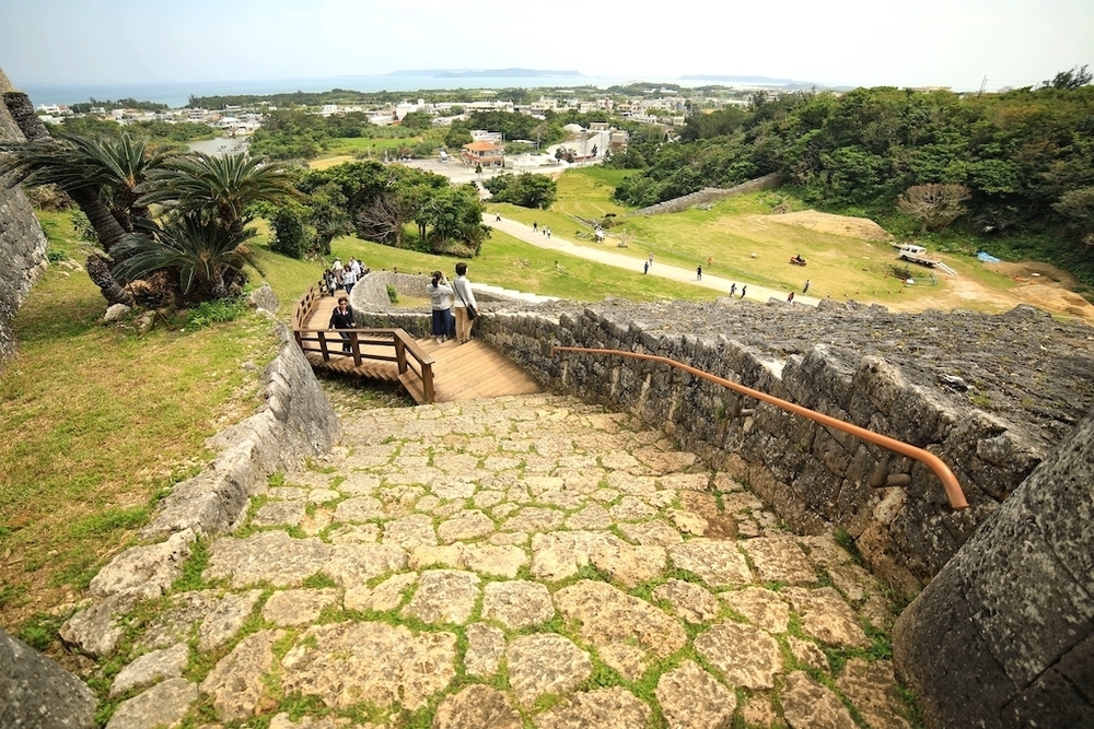 西に向かっていくと5.5kmほどで、うるま市を代表する観光地である勝連城跡に到着します。この勝連城跡は、2000年11月に那覇市の首里城跡などとともに「琉球王国のグスク及び関連遺産群」としてユネスコの世界遺産に登録された場所で、多くの観光客で賑わっています。