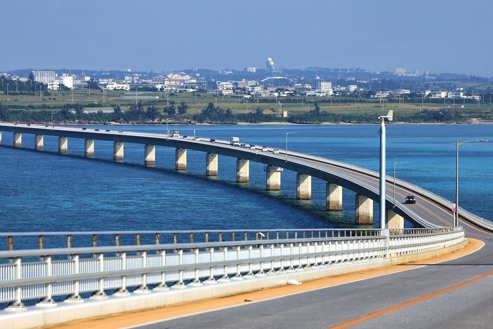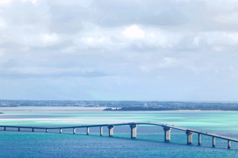 宮古島は海の綺麗さで日本トップクラスを誇りますが、晴れ間があれば島の至る所で宮古ブルーと呼ばれるコバルトブルーとエメラルドグリーンの感動の眺めを見ることができます。宮古島と伊良部島を結ぶこの伊良部大橋は2015年に開通し、無料道路としては日本最長(3540m)の橋です。