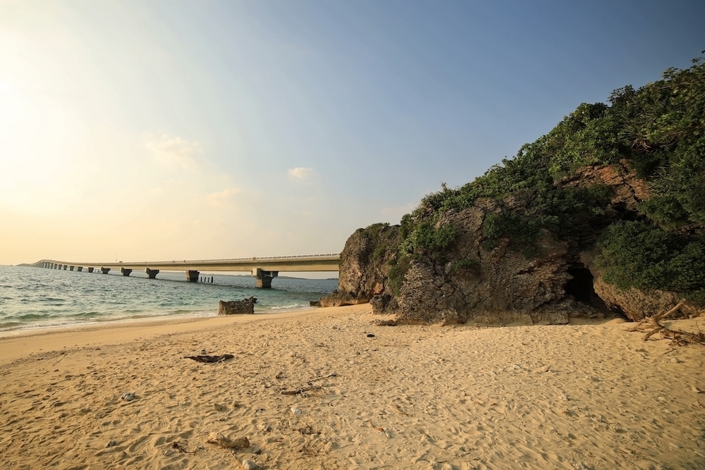 宮古島のシーサイドブリッジランは伊良部大橋、来間大橋とこの池間大橋の3つがありますが、この来間大橋のオススメの時間帯は朝です。東側に朝日を見ながら、西側のエメラルドグリーンを見る。感動のひとときはまさにこのことです。