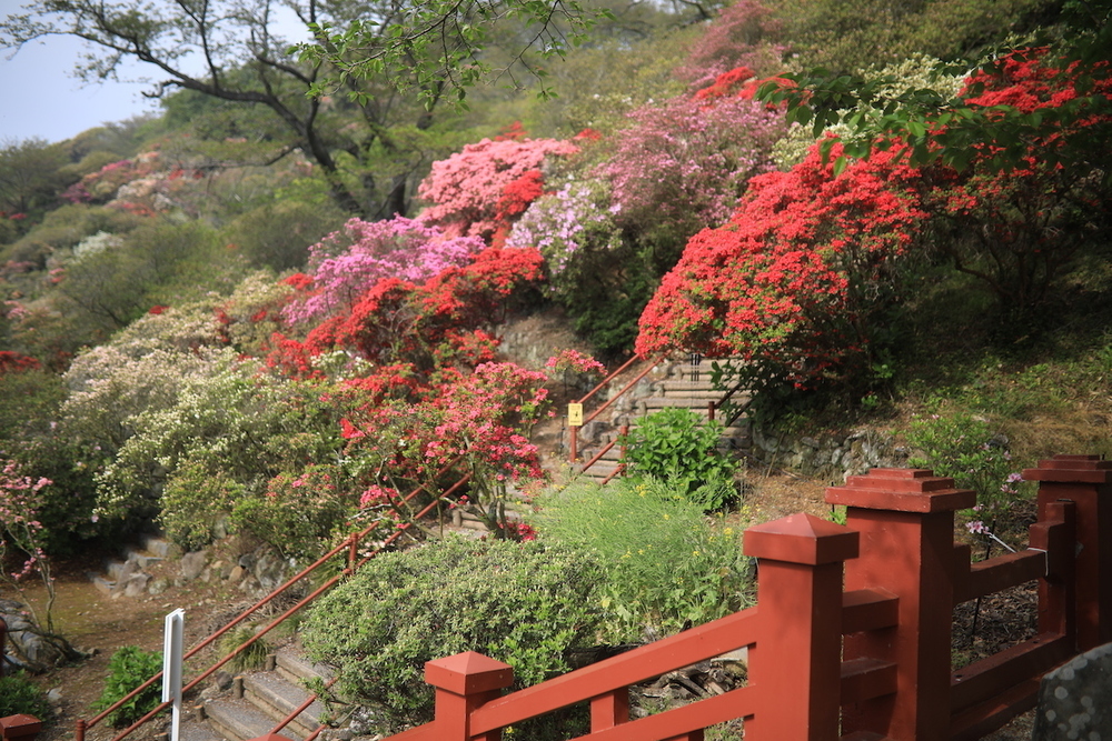 序盤は日本三大稲荷といわれる佐賀県鹿島市の祐徳稲荷神社に向かう。春は神社の楼門をくぐる前に向かい側にある花園が見頃で、鮮やかなツツジなど見応えのある花を見ながら、プチトレランとばかりに祐徳稲荷神社を見下ろせる高台に出ることができる。