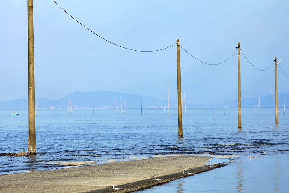 後半は有明海沿いに向かって東に進んでいく。海沿いの道は山あいにある祐徳稲荷神社とは違った雰囲気で開放的。そして、目的地の海中鳥居に到着すれば、潮の満ち引きによってその姿を変える神秘的な鳥居を見ることができる。