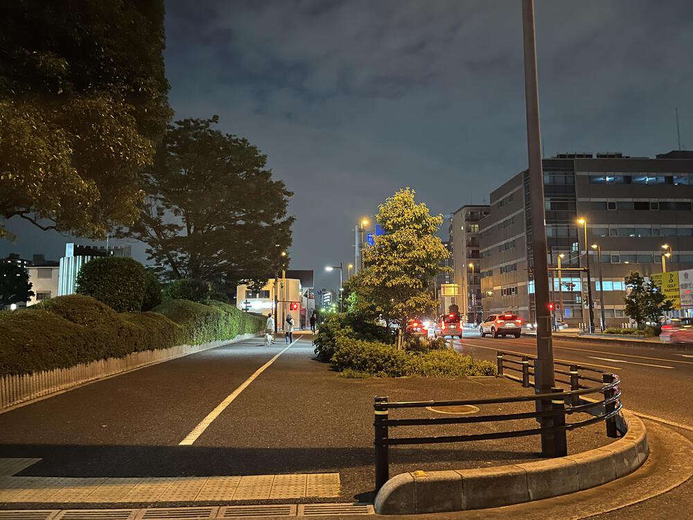 幅6mの広い歩道で街路灯も途切れません。