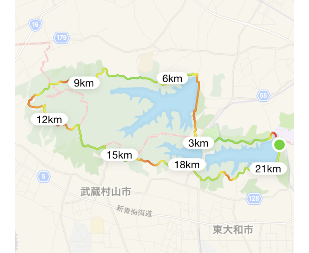 ※狭山湖のあたりでGPSのつけ忘れに気付き、途中からのコース反映になっております。実際は2枚目にアップしている通り、多摩湖スタート&ゴールの22Km丁度です。