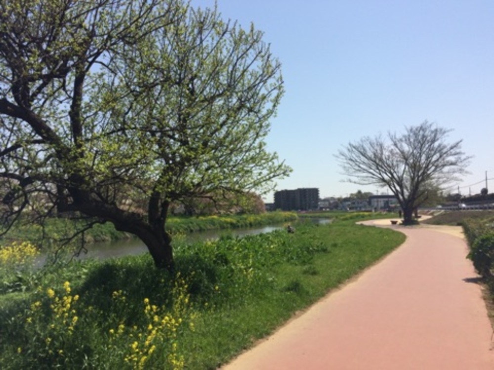 このコース、侮るなかれ、同じく4月には左右いっぱいの菜の花の絨毯もコースを彩ります。近年整備された土手には芝桜やチューリップも咲き誇り、さらに、宮内庁の埼玉鴨場の隣に位置する越谷梅林公園では3月上旬に梅の花が満開を迎えます。そして、ゴールの「越谷健美の湯」直前には、真っ白なハナミズキが祝福してくれます。