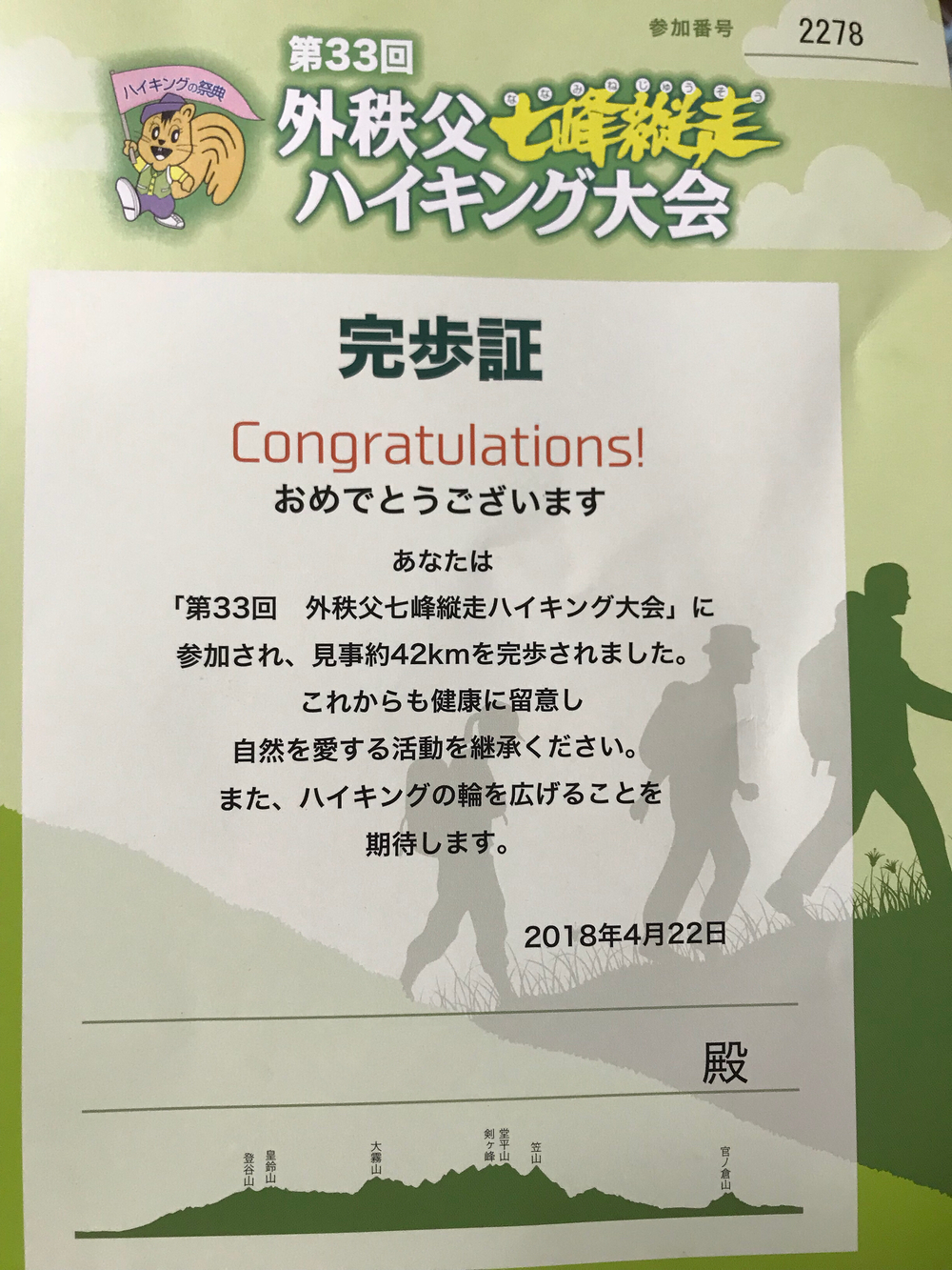 外秩父七峰縦走ハイキング大会を完歩した。七峰縦走コースの登山道は全般的に狭く、追い抜きが難しいです。