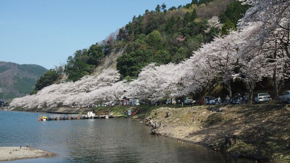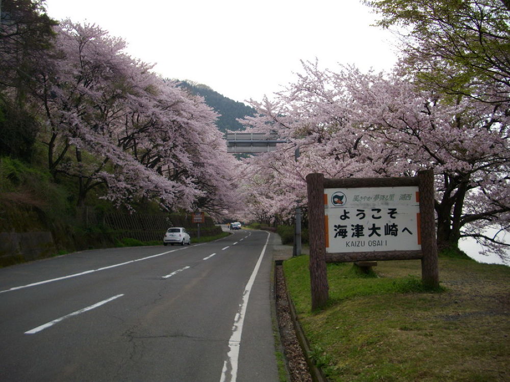 奥びわ湖にある海津大崎の桜は日本のさくら名所100選に選ばれており、4月の初旬から中旬にかけて例年咲きますが、大変たくさんのドライブ客や観光バスで賑わいます。