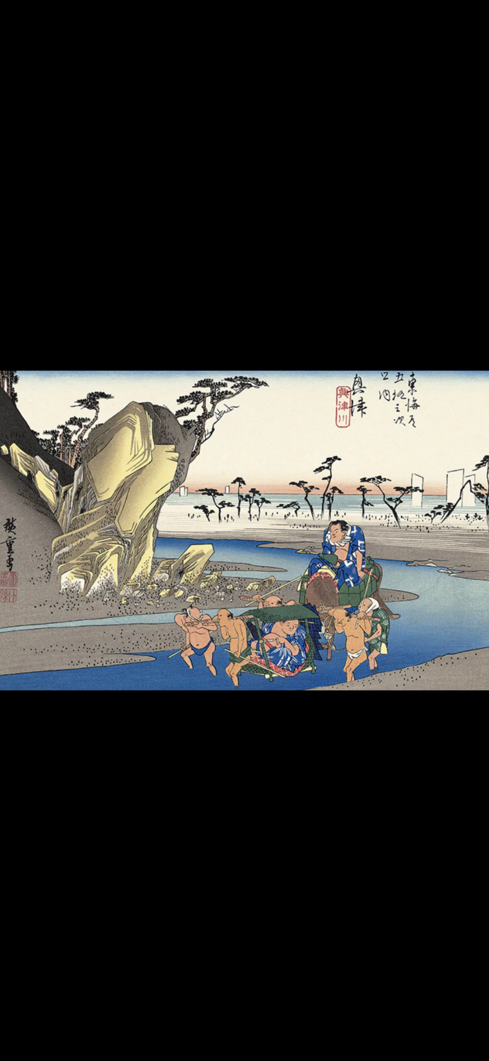 広重の「東海道五十三次 興津宿」を巡ります。当時の興津川は、幕府が橋を作る事を禁じていたため、人々は歩いて川をを渡っていました。広重の絵には、籠に力士が乗っているのがわかります。当時はお抱えの大名の為に相撲をとる風習があったそうです。