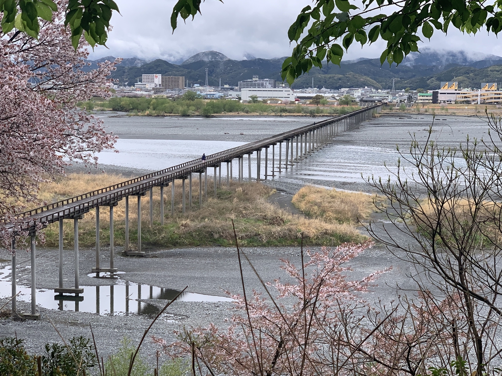 東海道本線の鉄橋をくぐると程なく蓬莱橋の登場!通行料100円を支払って橋を渡る。