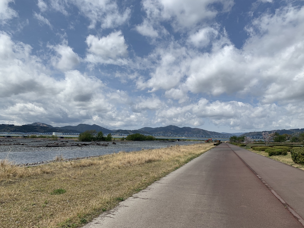 大井川緑地公園にクルマを停めて、まずは蓬莱橋を目指す。この道は大井川マラソンコース「リバティ」の一部でとても走りやすい。