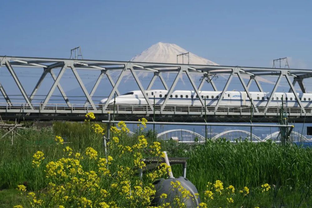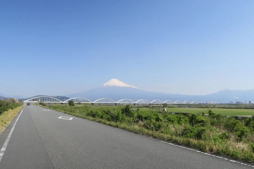 富士川駅をスタートして、工場の間を抜け、川沿いの土手へ。そこから南下していき、河川敷に降りる階段を下ったあたりが、1枚目の写真を撮った地点です。そこから、北上していくと、富士山の見え方が変わってきて、橋梁の下に富士山を配置する構図でも撮れます。橋をくぐって北上すると、新幹線から見るのと同じ風景が見られます。