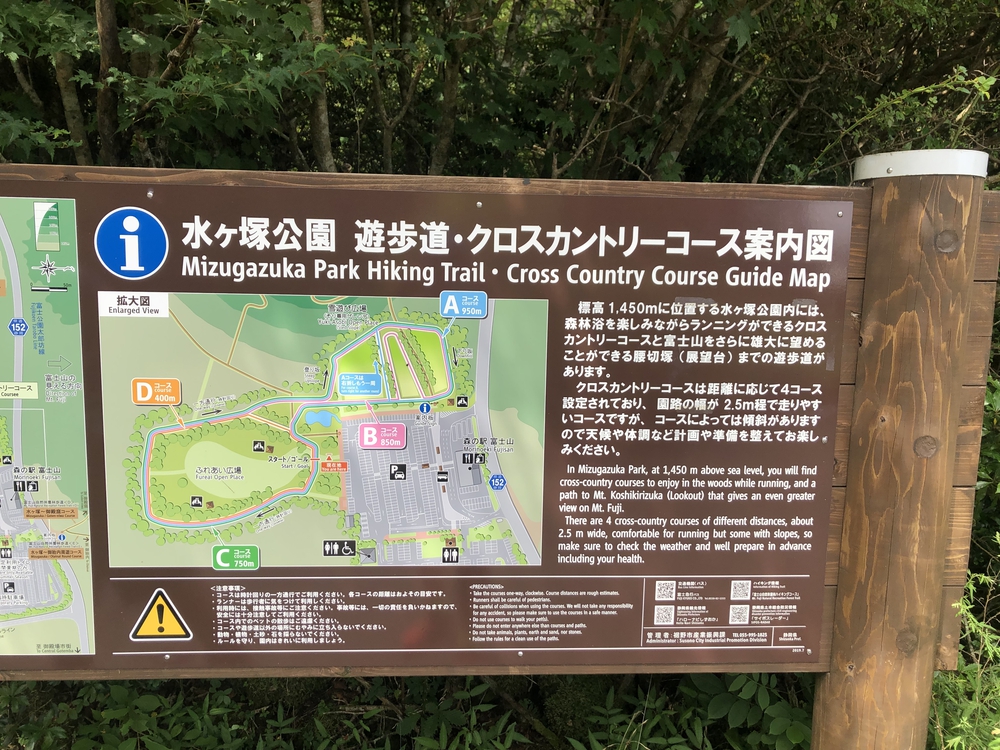 富士登山の富士宮口シャトルバス発着場となっている「水ヶ塚公園」内にあるクロスカントリーコース。標高が1400mありますので高地トレーニングにもなります。
