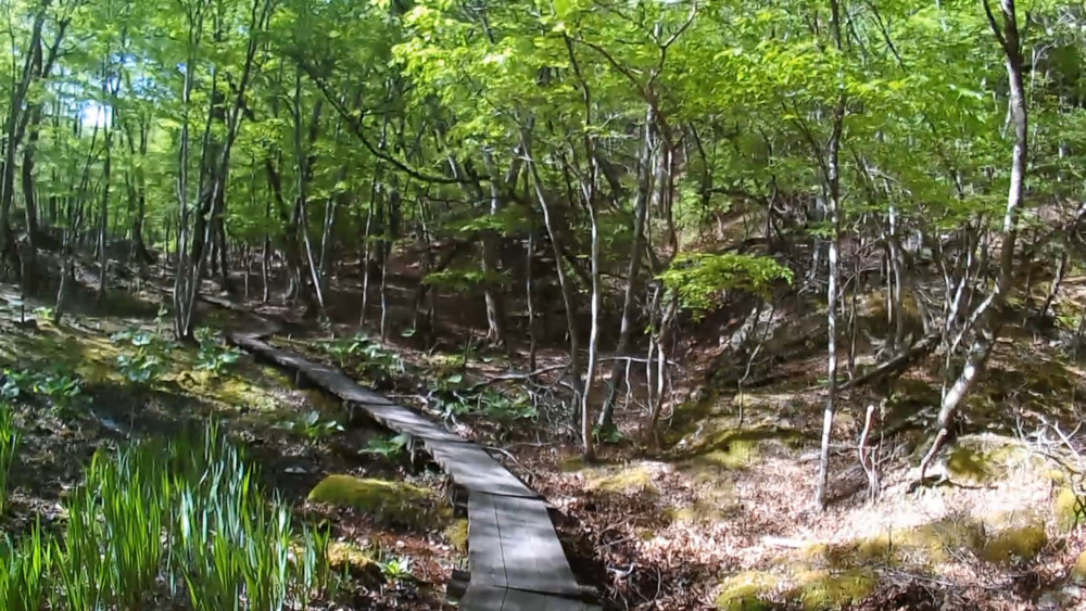 むささび橋を渡り対岸へ木道の湿地帯「底なし沼」を通ります。ここはモリアオガエルの生息地と知られているようです。虹見橋を渡り右手に「虹見の滝」