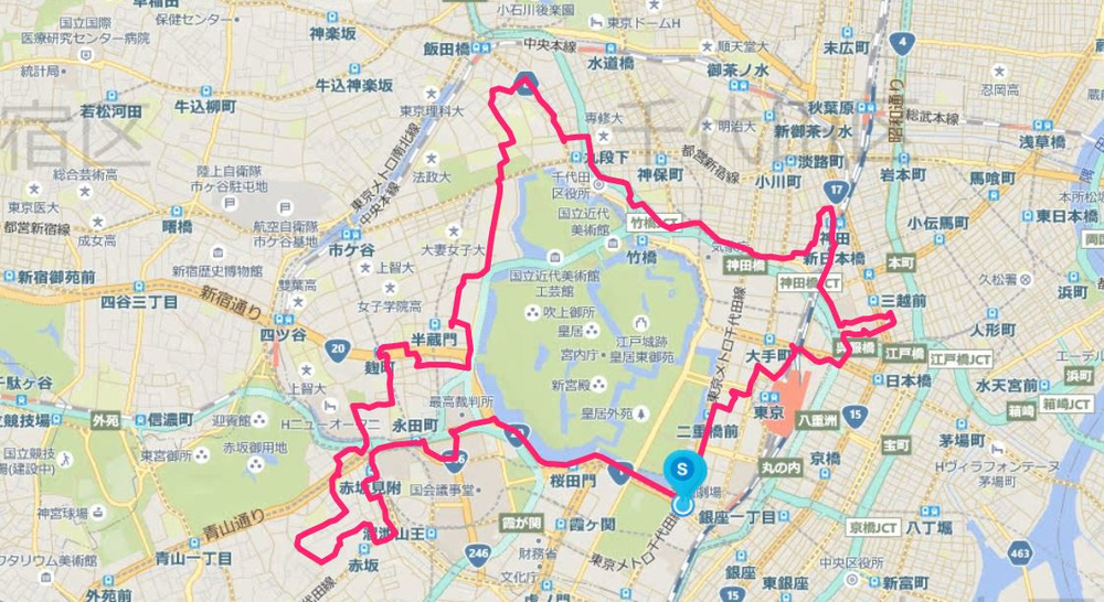 休日ランナーさんのところで知り、ちょうど東京出張があったので走ってきました。GPSの軌跡をたどると北海道になるというお絵かきランです。