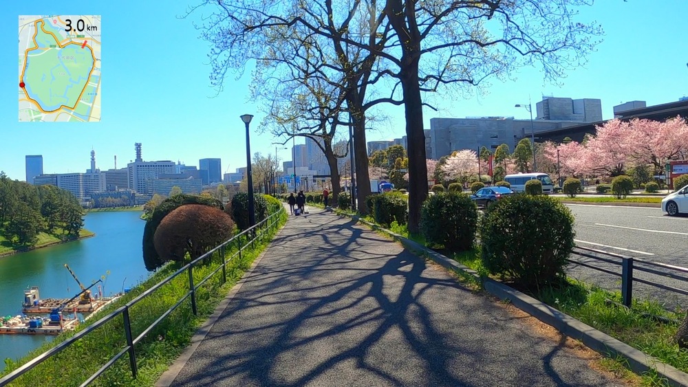 竹橋交差点を渡り、北の丸公園、武道館を通り、千鳥ヶ淵縁道と千鳥ヶ淵公園の桜の下を駆け抜けます。