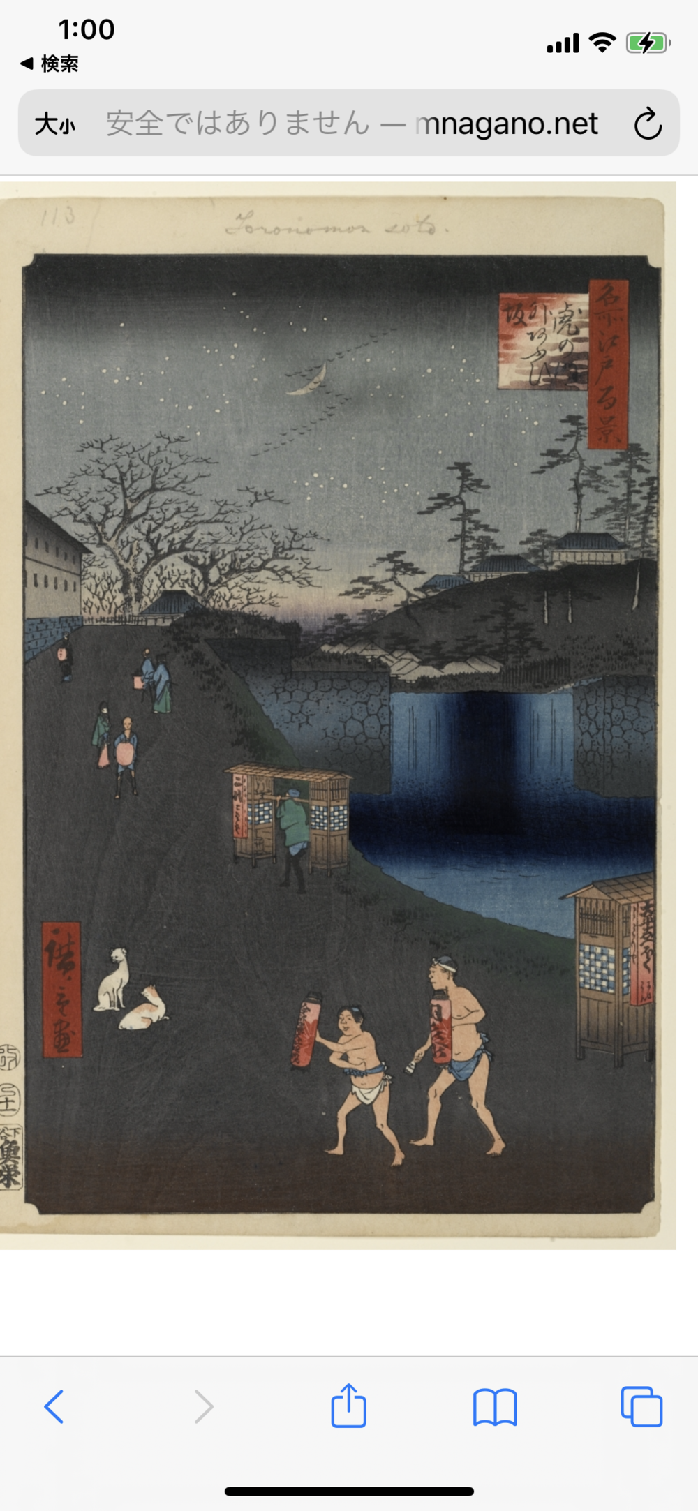 広重の「虎の門外あふひ坂」を巡ります。作品が夜の描写の為、久しぶりに夜の皇居を走りました。今まで気づかなかったのですが、皇居+国会議事堂+東京タワーと言うとても東京っぽい写真が撮れました。警視庁、外務省、財務省を抜けて、虎ノ門に向かいます。作品の面影は全く無くなってしまった現在ですが、提灯に書かれている金毘羅も文字の「金毘羅大権現」は、ビルの谷間に堂々と存在していて見事でした。会社帰りのサラリーマンの皆さんがお参りしていかれるのも「場所ならでは」と感じました。金毘羅の文字から香川のうどんを思い、食べたくなったので、神田の讃岐うどんの店で寄り道をしました。稲荷湯は、荷物預かりと着替えが出来てかなり助かりました。ランナーの聖地のような存在です。