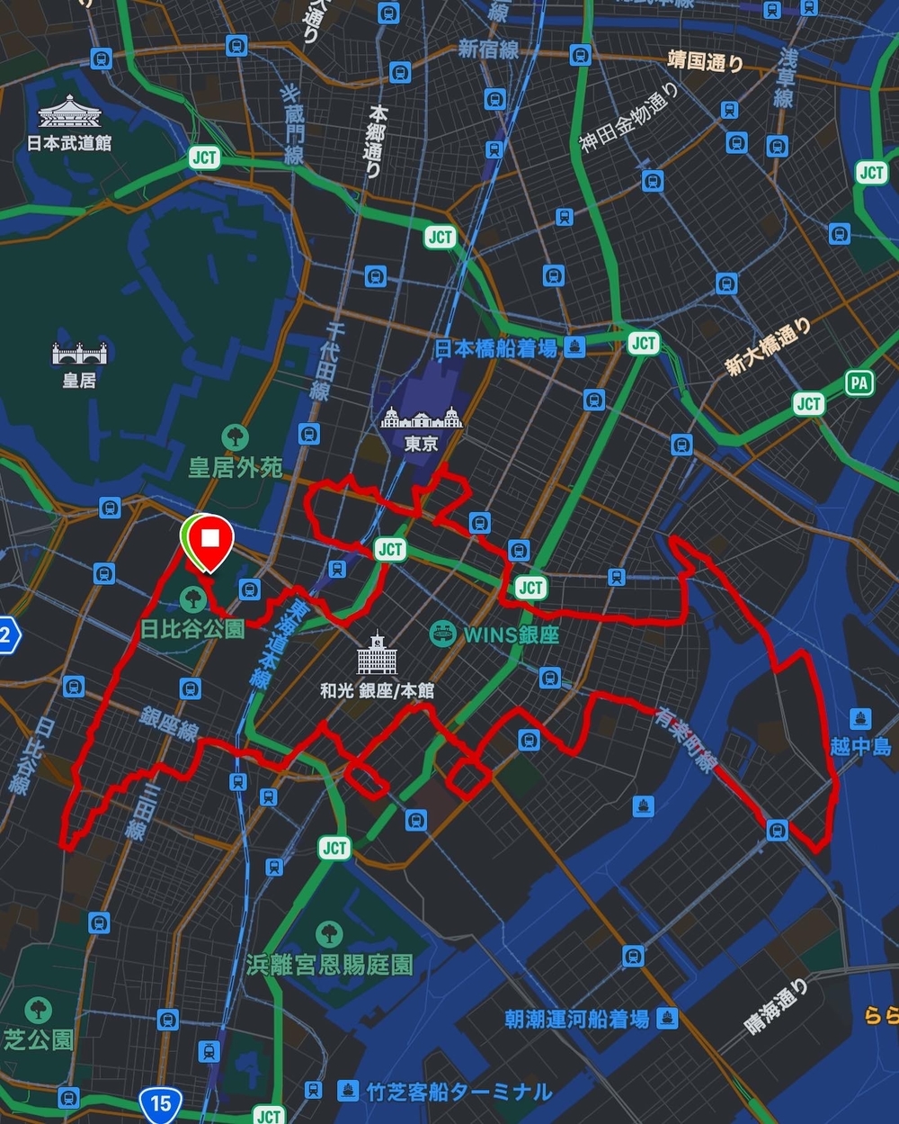 銀座まで走って、銀座➰新橋の飲み屋街を通り抜けて