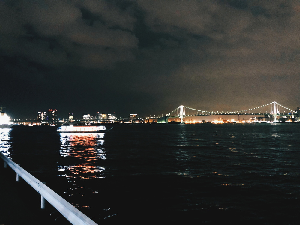 折り返し地点から見渡す夜景はとにかく綺麗なので、スマホで写真を撮るのを忘れずに☆ 対岸に視線を移すと、竹芝ふ頭に泊まる船や、東京タワーもチラッと見えます。