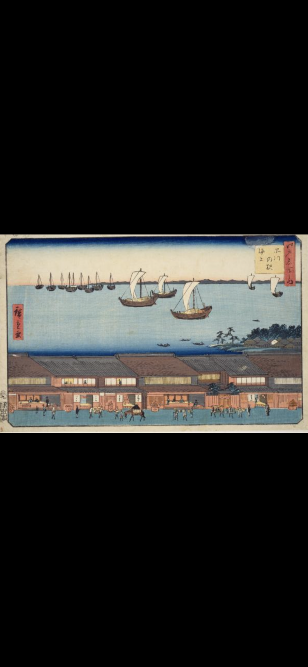 広重の「江戸名所之内」から「品川の駅海上」を巡ります。この作品が描かれた当時の江戸の人々の往来は、陸路に限られており、海での旅は禁じられていたそうです。ですので、作品にも、物資輸送の弁財舟のみが描かれています。