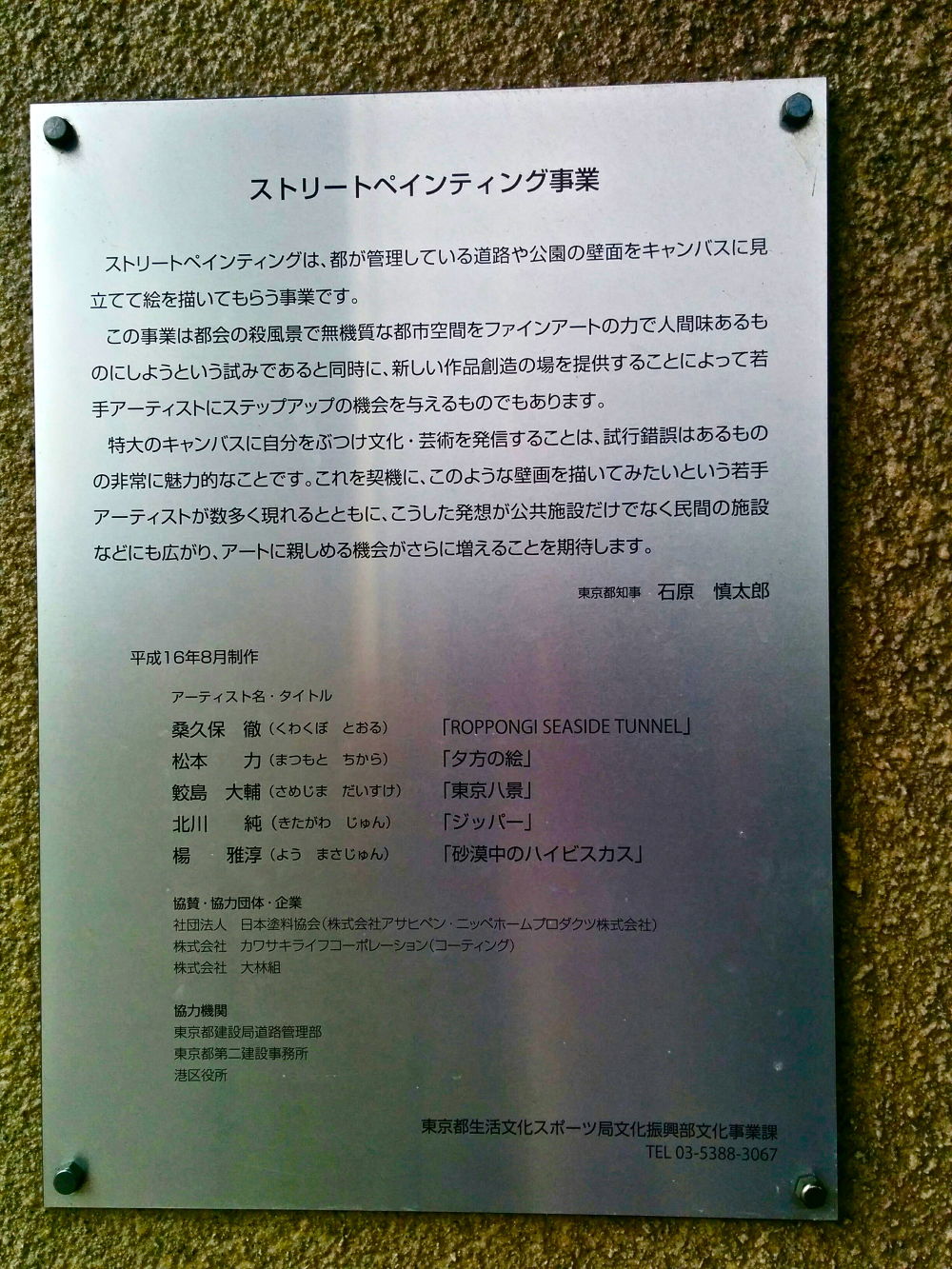 平成16年、石原慎太郎氏によって、東京都の施策として代々木公園、東京体育館、駒沢公園、そしてここ六本木の無機質な壁に“ストリートアートペインティング事業”としてストリートアートが描かれました。