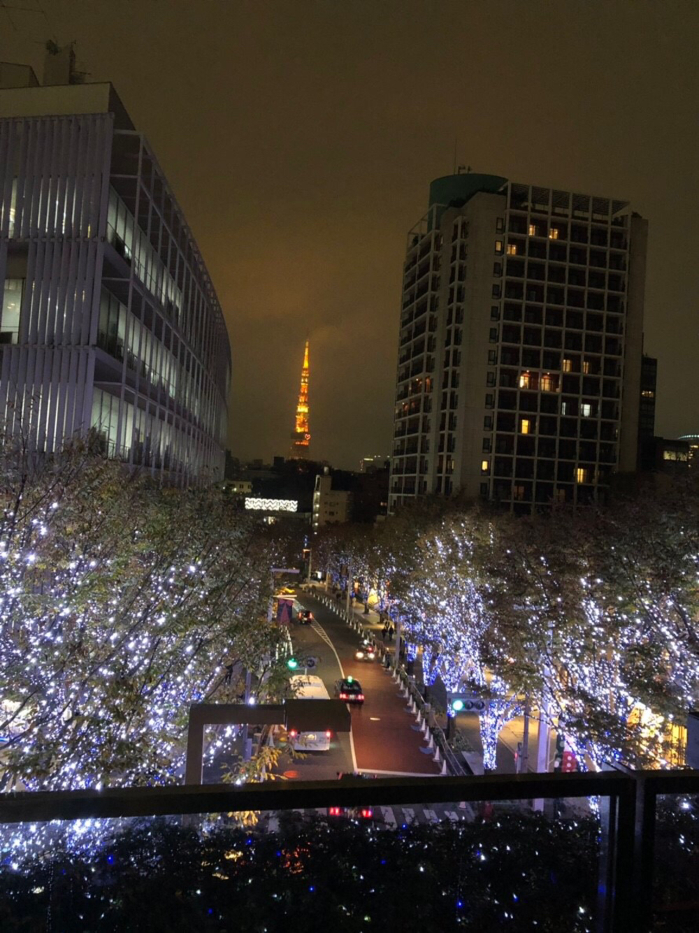 2.六本木ヒルズ二階からは、けやき坂に照らされる青と白のスタイリッシュな光をバックにハート形の♥️東京タワー