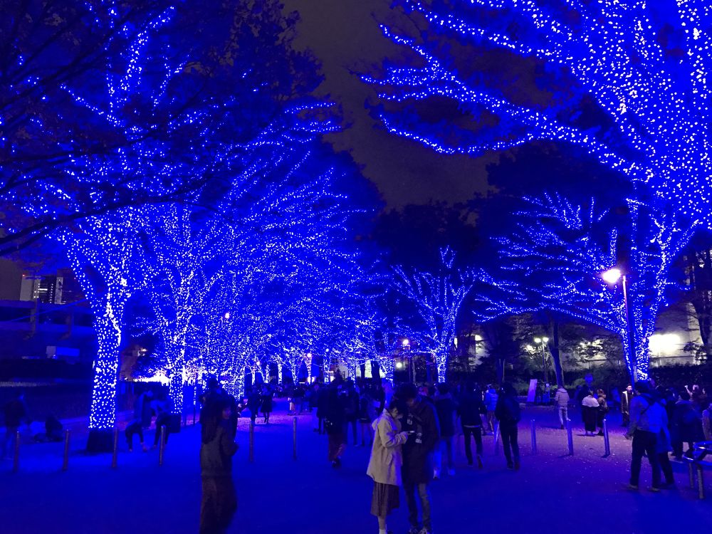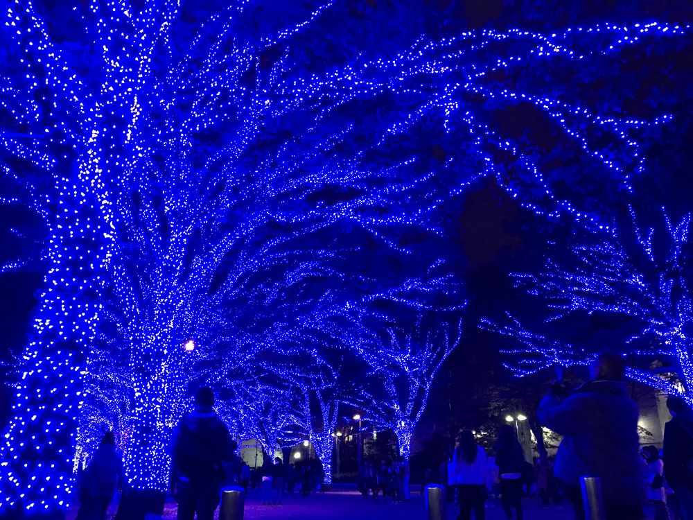 青の洞窟イルミネーションは、渋谷公園通りから代々木公園内のケヤキ並木までの750mで、今回は2017年1月9日までとのこと。