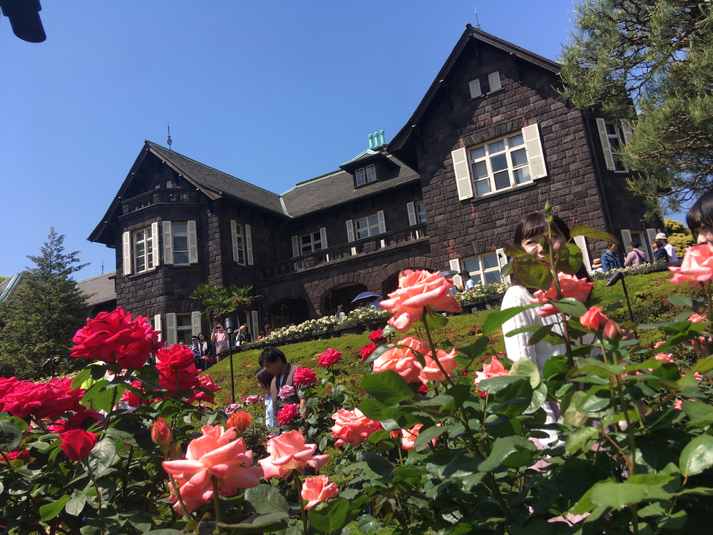 二つ目を平らげたのち、いよいよこたびのメインイベント、旧古河庭園の薔薇園に。五月晴れの空のもと古びた洋館をバックにした色とりどりの薔薇が美しすぎる。