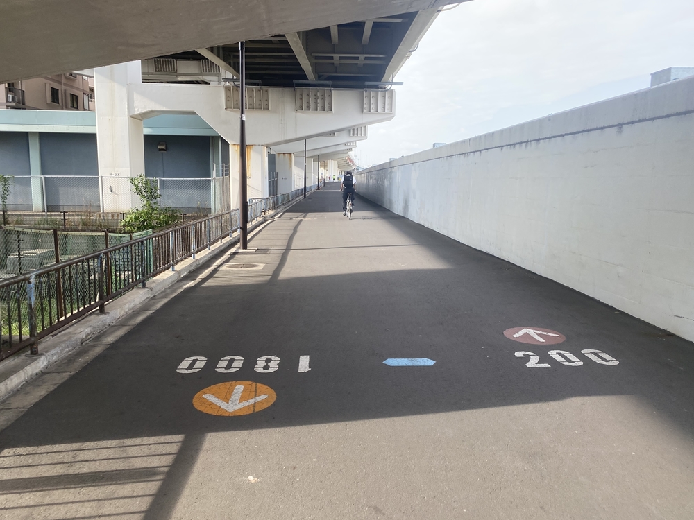 特徴は、首都高速道路の真下を走るので日陰が多いことと、距離表示があること。また、隅田川沿いのテラスを走ることもできます(こちらには距離表示はありません)。