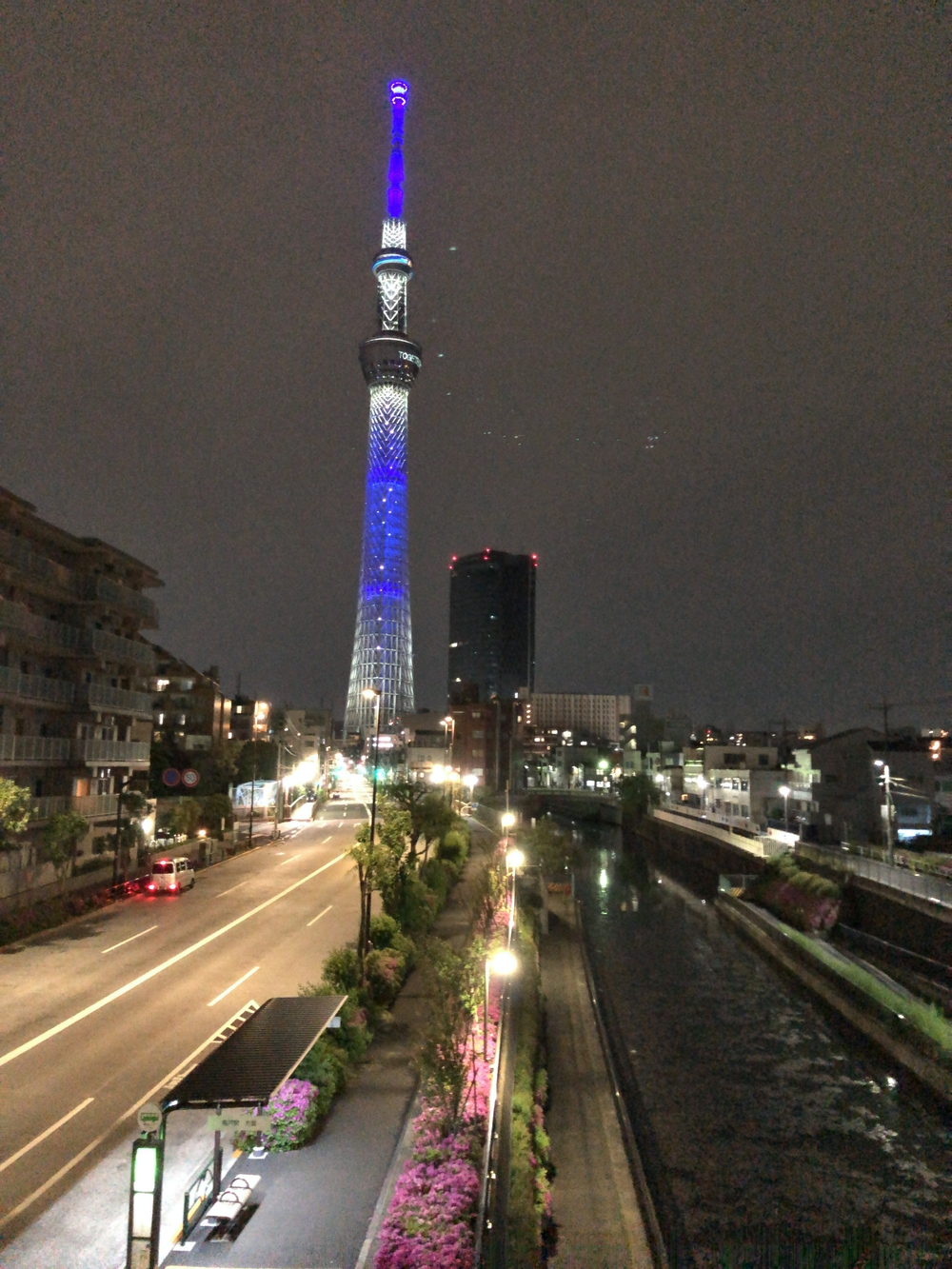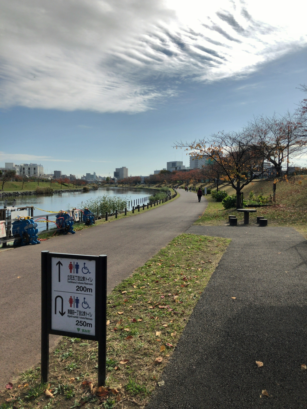 スカイツリーを起点に川沿いを走るコースです。旧中川水辺公園は距離表示のある遊歩道があり、ランニングや散歩に最適です。折り返し後は、ツリーを目指して戻ってきます。春は桜も綺麗で、のんびりした気持ちになれます。