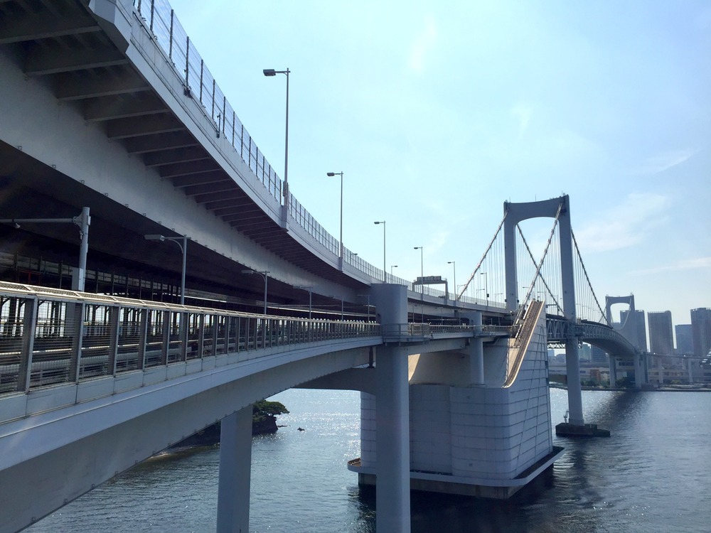 レインボーブリッジからは東京湾を一望できます。いくつか開けたスポットがあるので、その辺りで一息ついてもいいかもしれません。