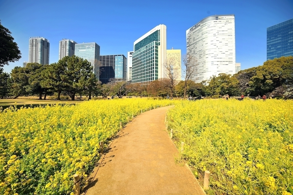 桜が咲く頃までは菜の花が綺麗に咲き誇り、広大なエリアでリラックスができる。庭園内はジョギング禁止なので、カフェでゆっくり休んだり、花々をゆっくりと鑑賞するのがいい。潮入りの庭園内ではエイなど海の魚を見ることもできる。