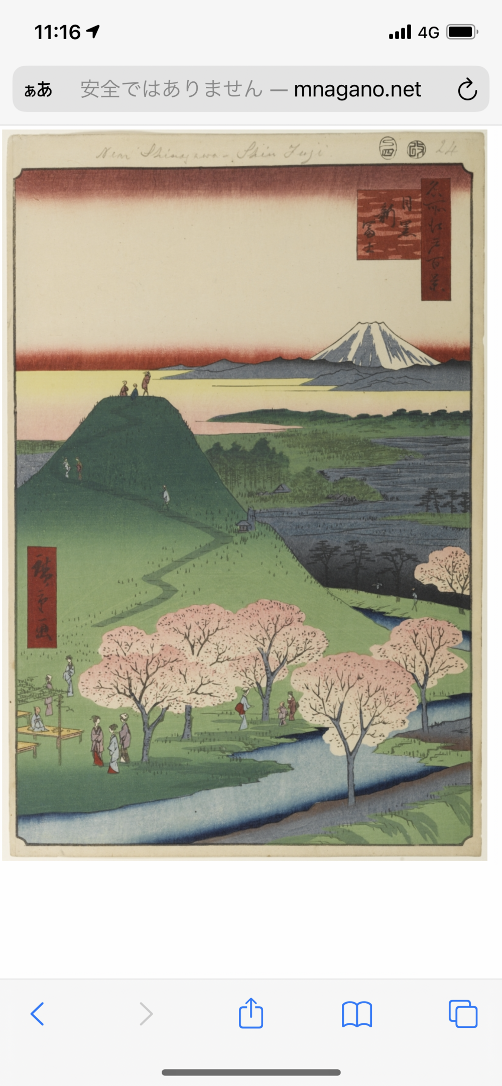 広重の「目黒新富士」を巡ります。この時代、空前の富士山参拝ブームが起こり、多くの人が富士山登頂を目指しました。しかし、そこまで行けない人達の為に、江戸内に、多くの人工富士が造られたそうです。作品の左に人工富士が見られます。目黒川沿いは、急長坂の名坂が多く、近郊での足の鍛錬には最適です。別所坂、茶屋坂、行人坂、馬喰坂、なべころ坂を走りました。光明泉の露天風呂は、東急電車の走る音を聞きながら浸かれます。