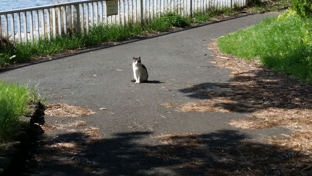 木々の様子がなんともいい風情で気持ちよく走っていたら、行く先に猫が一匹。足を止めてゆっくり近づいて話をしていたら、他の二匹が顔をだし、一匹は近寄ってきて、いきなりゴロンと寝転んでお腹をだしてくれました。なごみすぎて、まったくランになりません(笑。
