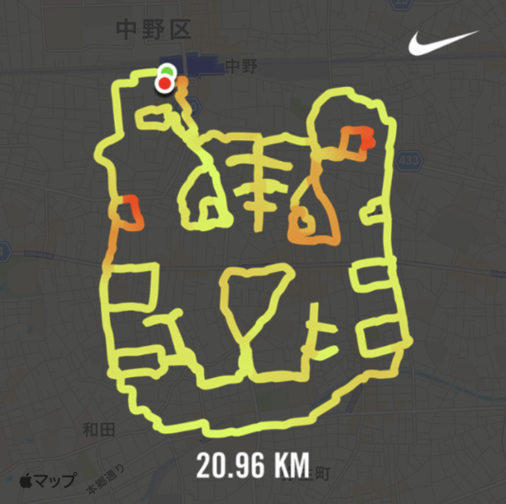 中野駅を起点にトラの顔を描くお絵かきランコース、ハーフマラソンの距離です。寅年の干支ランにどうぞ。沿道には栗まんじゅうが有名なこげつどう(虎月堂)があり、途中のエイドにいいかも。また、「寅」に関するスポットがほかにも一か所あります