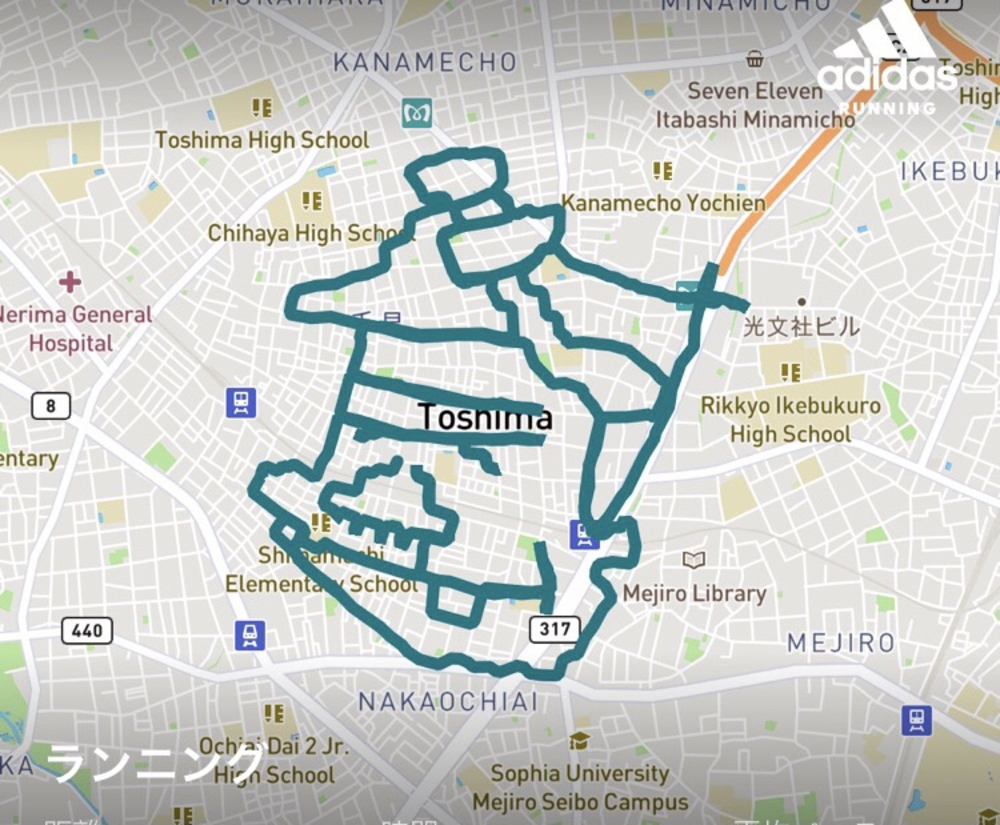 マンガの聖地・トキワ荘を起点に天才バカボンのパパをお絵かきする20kmのコースです。マンガやアニメに関する記念スポットや商店街、住宅地をたどります。鼻毛の往復がちょっと大変ですが、よかったら楽しんで走ってみてください。