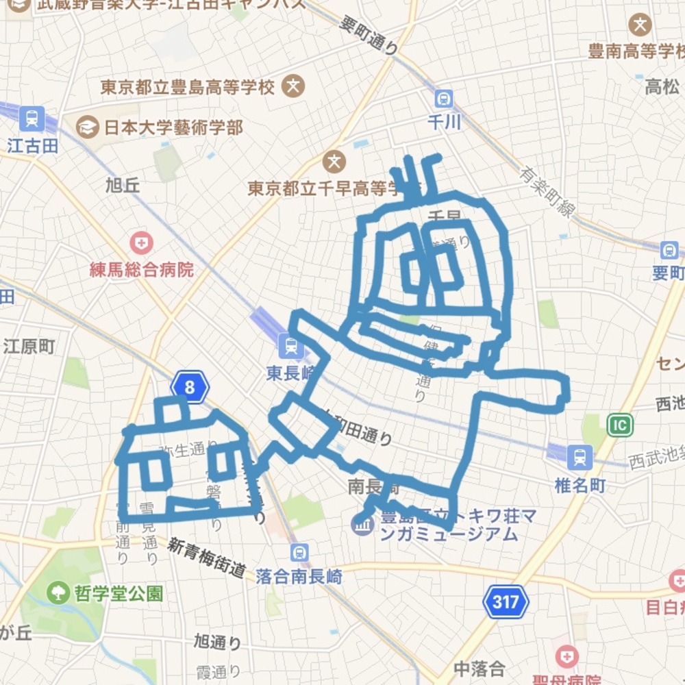マンガの聖地トキワ荘発、住宅地や商店街を辿ってお化けのお絵かきを楽しむコース。🎃を省略、オバQ単体なら12km程度です。