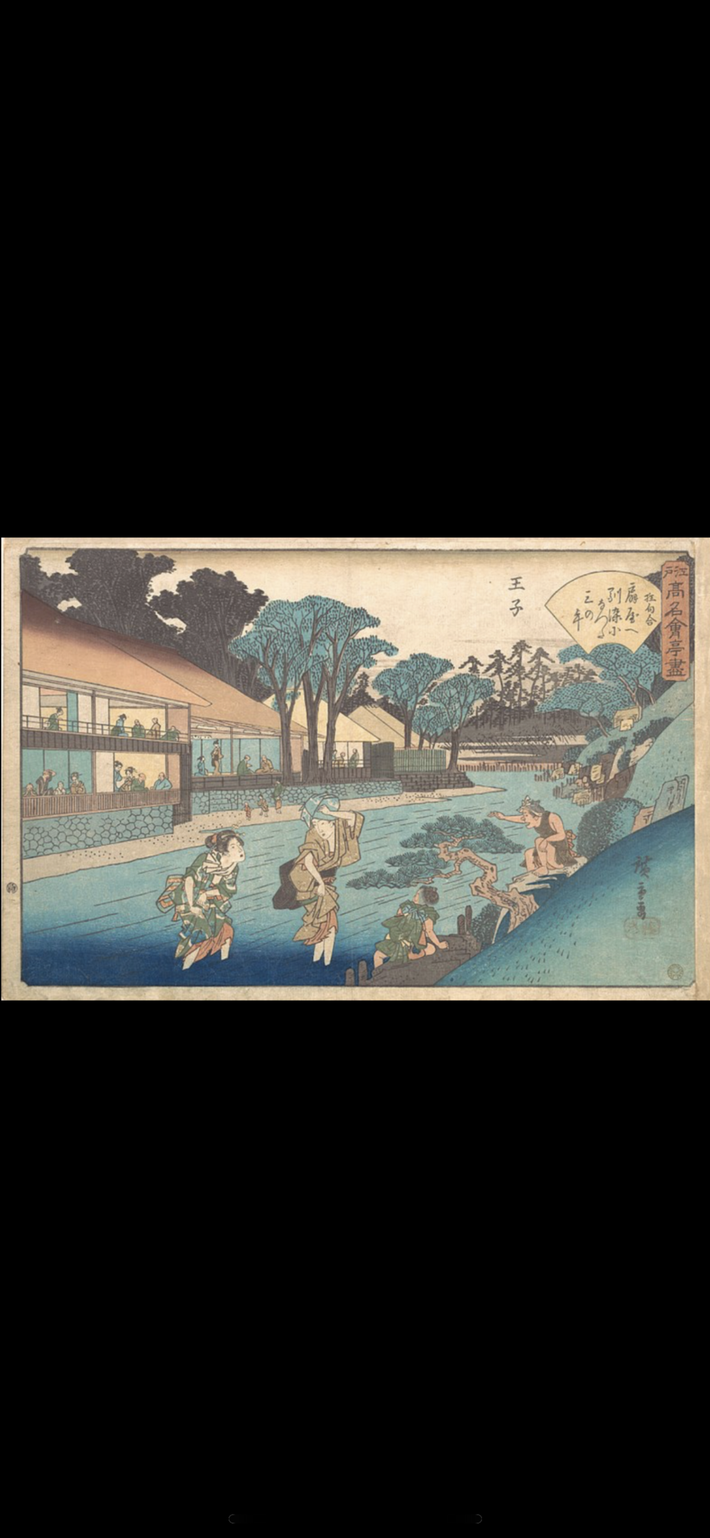 広重の「江戸高名会亭尽 王子 扇屋」を巡ります。江戸時代の王子は、王子稲荷参詣や滝浴みなどの観光地として大変賑わっていました。今は、新宿から電車で20分足らずで到着しますが、当時は歩いて1日がかりの距離で、遠からず近からずの旅行として丁度良かったのかもしれません。音無川付近には料亭が軒を連ねていたそうです。なかでも評判だったのが「海老屋」と「扇屋」で、江戸時代の料理屋番付などにも登場します。今はお持ち帰りのみとなりましたが、扇屋は健在で、14代目のご主人が暖かく迎えてくれて、卵焼きも絶品でした。