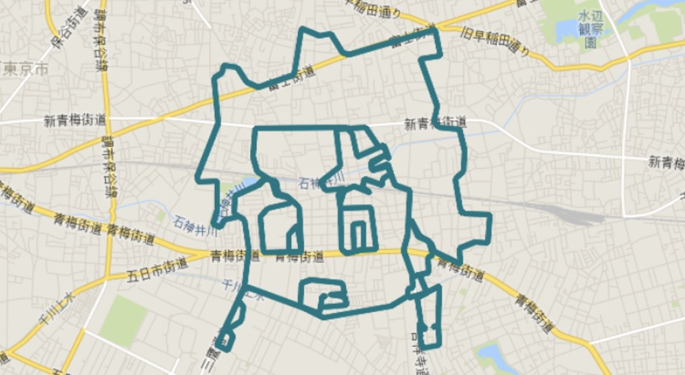鬼滅の刃、竈門炭治郎のお絵かきランです。東京都・練馬区、西武新宿線の武蔵関や上石神井駅付近の住宅地を走ります。目や鼻、火傷痕など複雑なルートが多いので、間違えないように全集中で走りましょう!