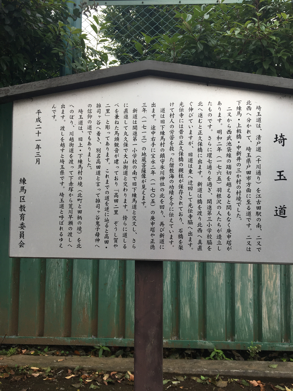練馬総合体育館を起点に、清戸道を経由して江古田二又から埼玉道へ。練馬大根を振りかざし?板橋区から独立を勝ち取った碑のある開進第三小学校へ、独立の気持ち新たに正久保通りをラン。平和台周辺では新しい埼玉道(放射第35号線、新大宮バイパス)が建設中。川越街道を渡れば早瀬の渡しを抜ければ埼玉県戸田、左折して光が丘公園を経由して練馬総合体育館に戻る15km。