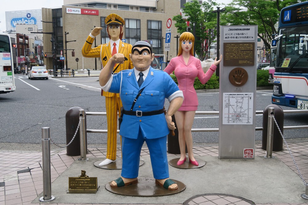 駅周辺には「こちら葛飾亀有公園前派出所」関連の銅像がいろいろあります。ちょっと面白い立ち寄りスポットは、北口の栄真堂書店。なんと中古レコードを置いています。南口のJazz38というジャズクラブでは、美味しいイタリア料理が食べられるので、コースに含めてみました。